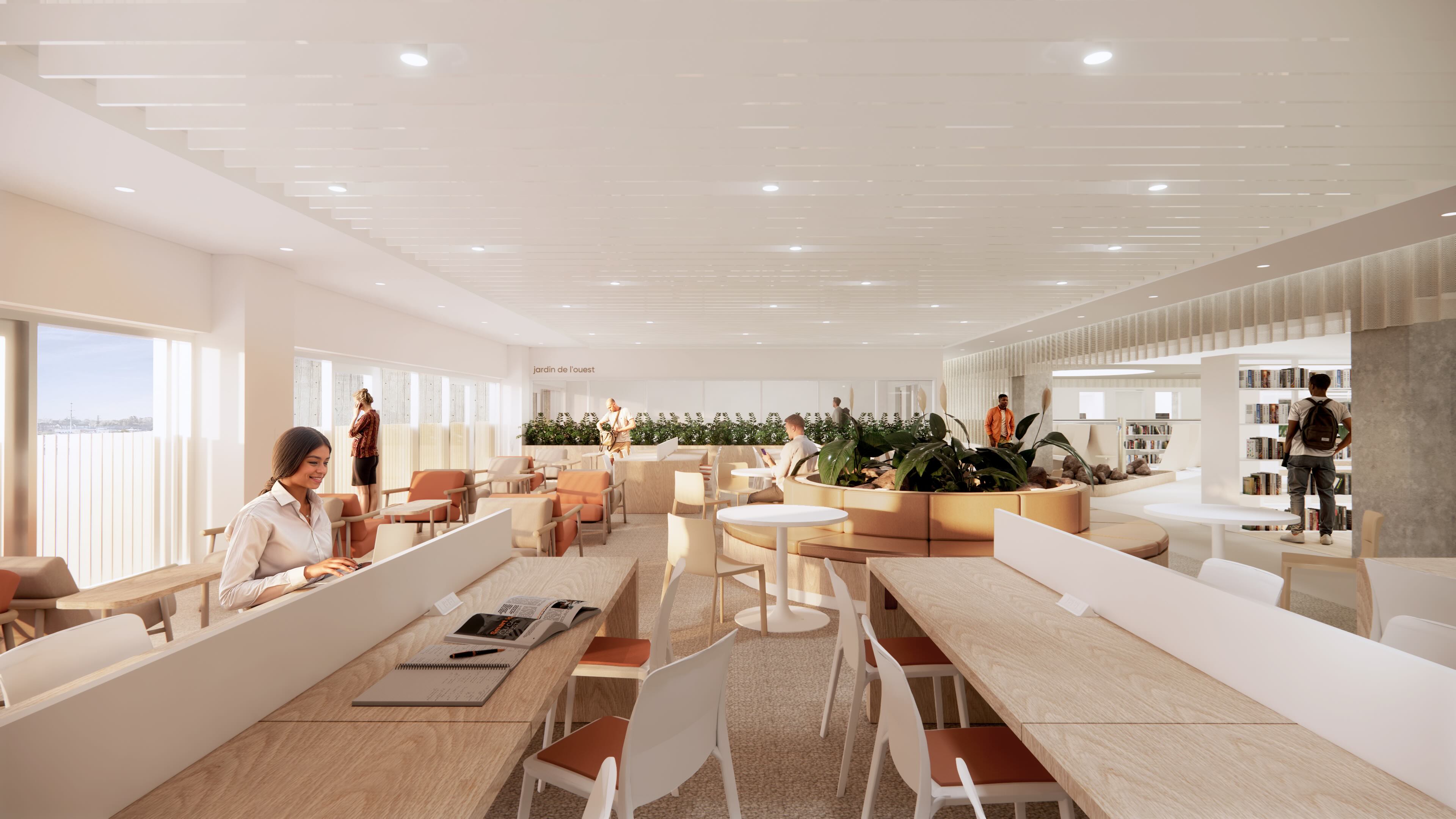 Cette approche a guidé la conception de la future Bibliothèque pour en faire un véritable espace de vie étudiante. L’objectif est d’offrir des lieux où il sera agréable d’étudier, de travailler en équipe, de se rencontrer et de faire une pause, dans un environnement qui soutient aussi bien la concentration que le bien-être.