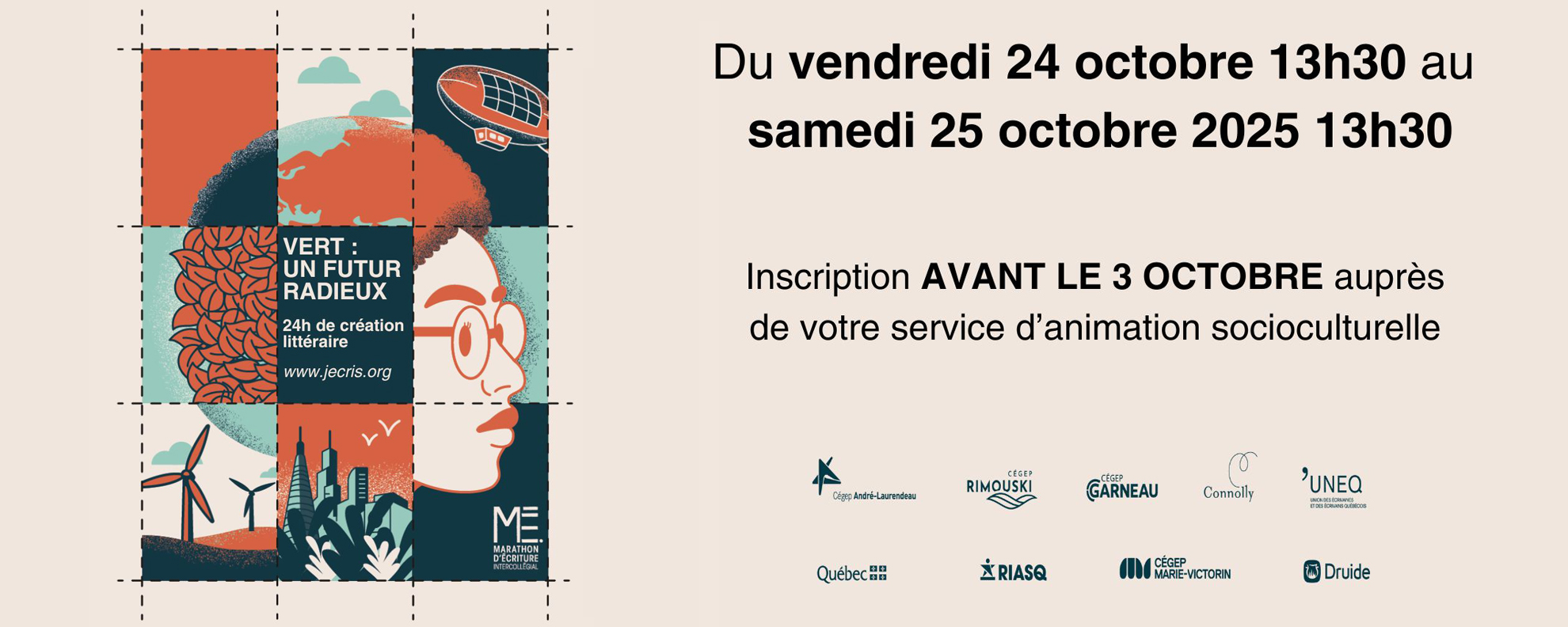Montréal, le 20 octobre 2025 – Le Cégep André-Laurendeau a l’honneur d’accueillir la 35e édition du Marathon d’écriture intercollégial (MÉI), qui se tiendra du vendredi 24 octobre à 13h30 jusqu’au samedi 25 octobre à 13h30.