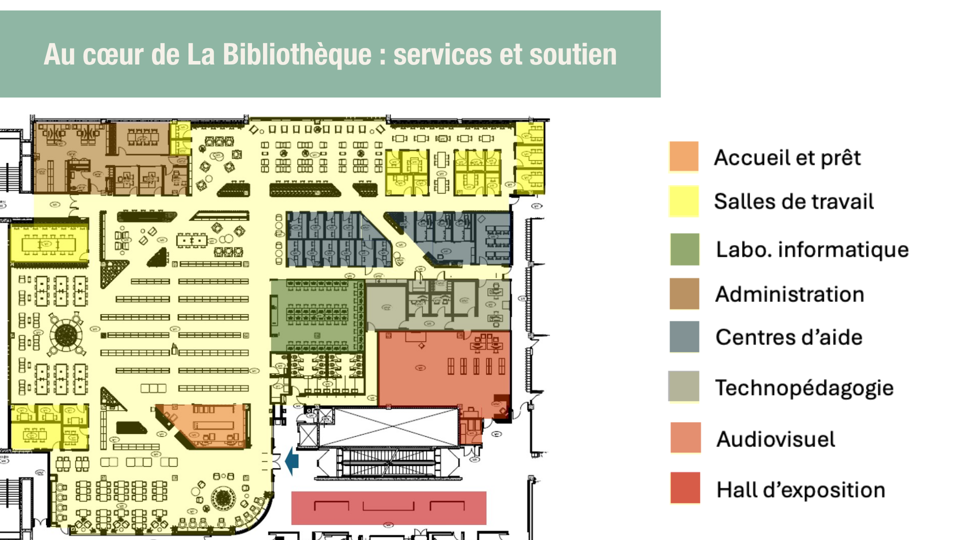 Dans ce nouvel espace, plusieurs services et ressources seront regroupés afin de faciliter l’orientation et le parcours de la population étudiante : accueil et comptoir de prêt, salles de travail, centres d’aide, technopédagogie, audiovisuel et hall d’exposition.