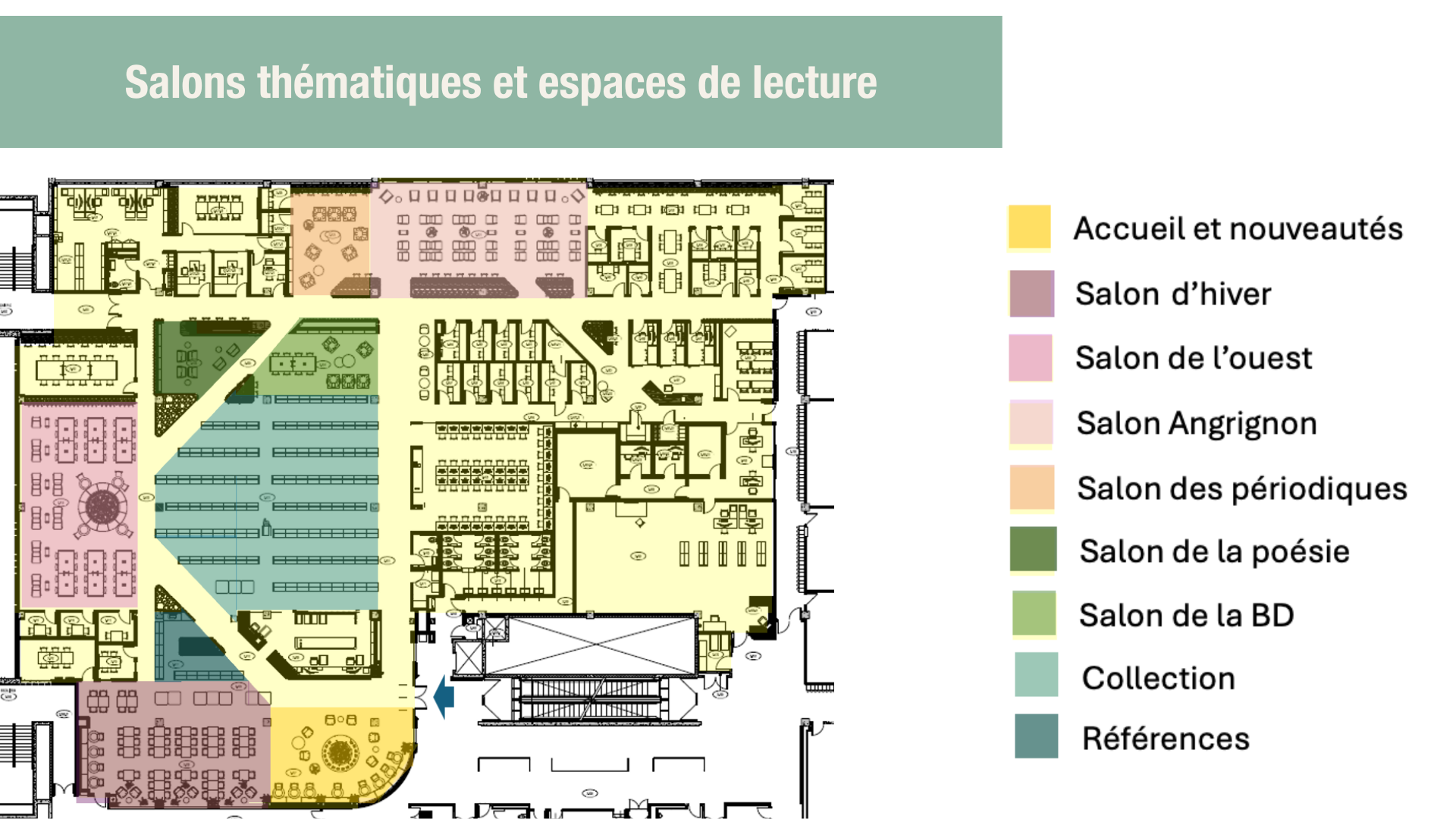 La Bibliothèque proposera aussi des salons thématiques et des espaces de lecture qui créeront des ambiances distinctes, dont un jardin d’hiver, le salon Angrignon, le salon poésie et théâtre, le salon de la BD, le salon de l’ouest et le salon des périodiques.