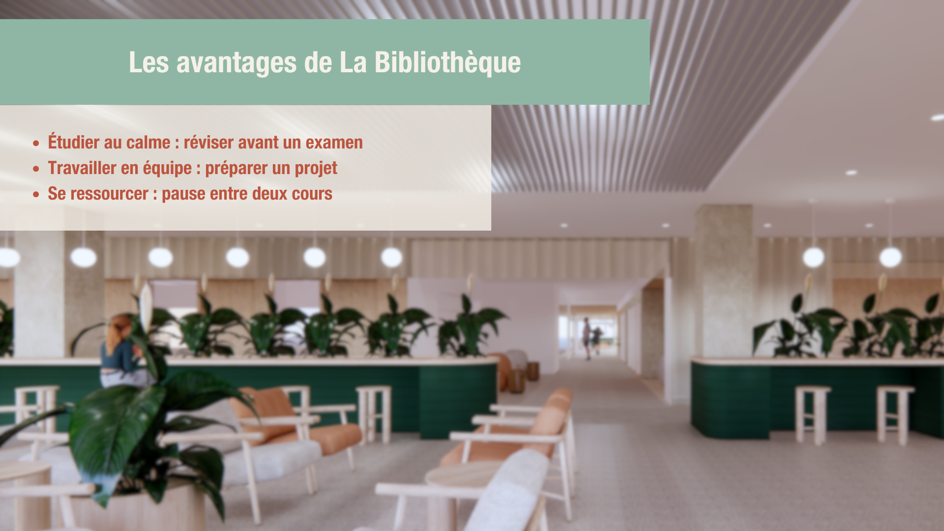 La transformation de La Bibliothèque vise à créer un espace de vie étudiante moderne, chaleureux et inspiré des principes de la biophilie. Zones calmes, espaces de collaboration, coins détente et salons thématiques permettront de choisir l’ambiance qui convient selon le moment.