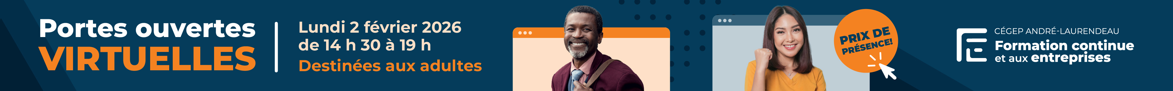 Vous pensez à vous inscrire à un programme d’AEC, à une démarche de RAC ou à un cours de perfectionnement ? Ne manquez pas les portes ouvertes virtuelles du 2 février – une occasion unique de découvrir nos formations et de profiter d’un avantage exclusif !